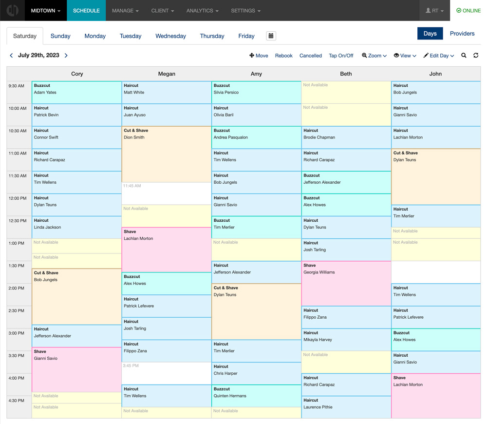 Manage your staff schedule, and customize specific staff’s service lengths, costs and availability. Easily add extra availability or block time for vacation or time off.